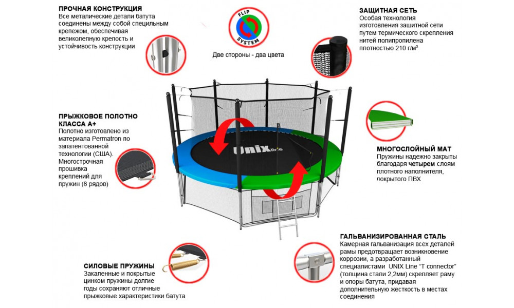 Помимо верхней защитной сетки, все батуты модельного ряда UNIX line оборудованы нижней защитной сеткой, которая препятствует проникновению под прыжковое полотно батута детей, животных, а так же попаданию посторонних предметов, и лестницей для удобства пользования. А в моделях диаметром от 10FT (305см.), в комплект входят специальные крепления батута к земле (колышки).